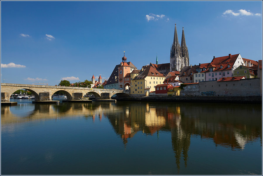 и шедеврами архитектуры город. Он был основан римлянами в первом веке нашей эры и до сих пор сохранил следы могучей античной цивилизации. Экскурсия по Регенсбургу никого не оставит равнодушным. Вашего внимания достойны музей знаменитого астронома Кеплера, который жил в Регенсбурге, музей гольфа, исторический музей. Для туристов с крепкими нервами рядом с Ратушей открыт музей старинных пыток. Можно бесконечно долго гулять по узким улочкам старинного города, заходить в поражающие пышным убранством соборы, любоваться «пламенеющей готикой» и помпезной лепниной барокко. В Регенсбурге отчетливо читается и итальянское влияние, отраженное в башнях патрицианских домов, напоминающих дворцы. Одним из самых известных символов Регенсбурга является знаменитый каменный мост через Дунай, возведенный в XII веке. Рядом с Каменным мостом находится популярная Колбасная Кухня, которая появилась в начале XII века и, как полагают историки, была, столовой для строителей моста. Сегодня она стала такой же достопримечательностью Регенсбурга, как и сам мост. Жаренные на открытом огне сосиски «Регенсбургеры», да еще с кислой капустой и пивом – что может быть лучше в перерыве между городскими прогулками. На южной окраине Старого города расположен дворцовый комплекс и роскошный парк герцогской семьи Турн унд Таксис, которая в течение долгого времени правила Регенсбургом. Также город славится своими уютными кофейнями, где подают кофе, чьи рецепты приготовления уходят в глубокое прошлое. Кроме этого, Регенсбург –либеральный и демократичный город. В нём на протяжении многих веков спокойно сосуществовали католики и протестанты, коренные жители и гости, богатые и бедные. Здесь комфортно абсолютно всем. Старина и современность подружились в Регенсбурге и смели создать органичную атмосферу уюта, приятно разбавленную городской суетой.