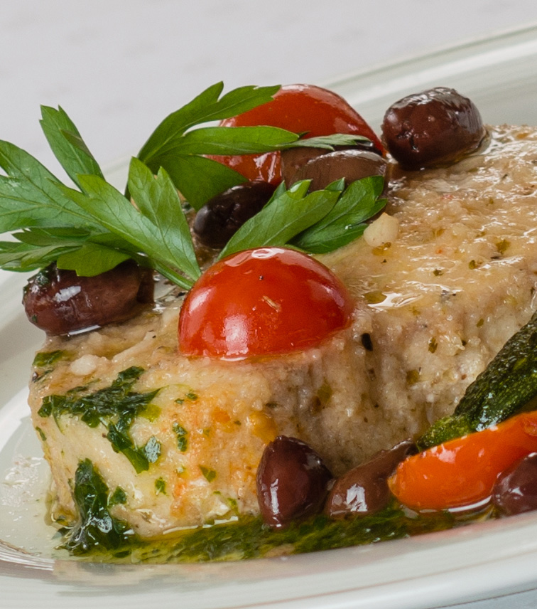 - Утка конфит (konfit) с карловарскими кнедликами и красной капустой - Стейк из рыбы-меч, запеченный в папильотке, с помидорами черри и оливками, картофель «grenaille» - Стейк из антрекота, картофель, запеченный со сметаной, перечный соус